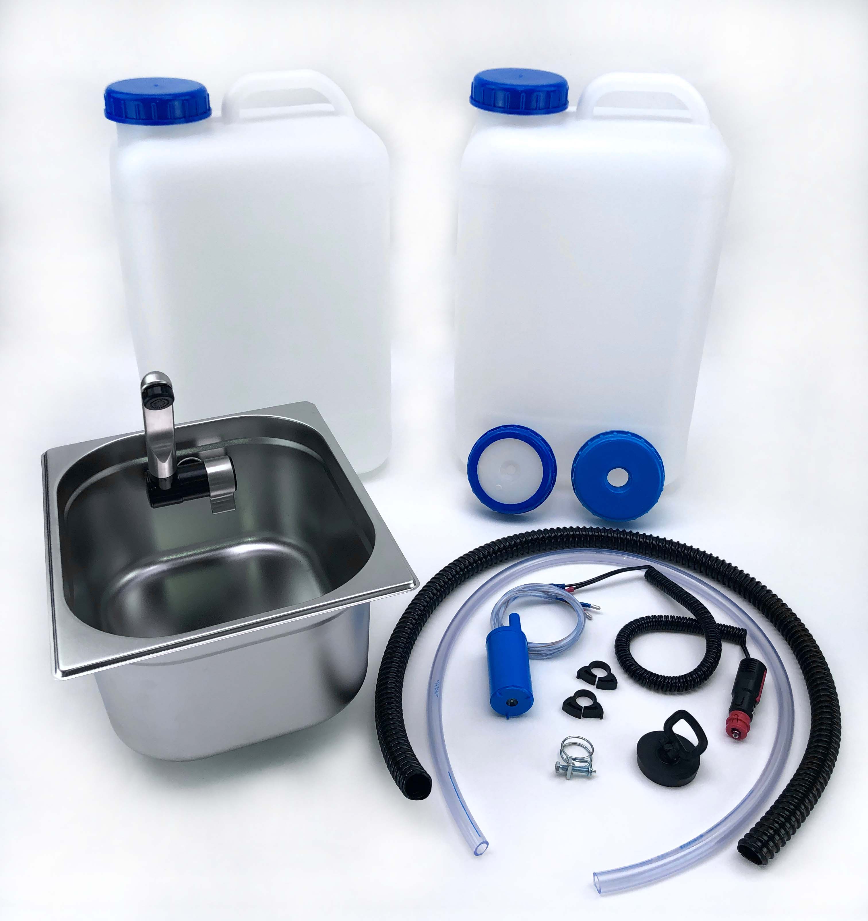 Mit unserem Bausatz zum Selbstausbau bekommst du alles, was du für eine funktionale Spüle im Camper oder Marktstand brauchst – vom Edelstahlbecken über Frisch- und Abwasserkanister bis hin zu Pumpe, Wasserhahn und Schläuchen. Dank farblich markierter Anschlüsse, Anschlussplan und Ausschnittschablone ist der Einbau unkompliziert und fehlerfrei. Einbauen, anschließen, losspülen!